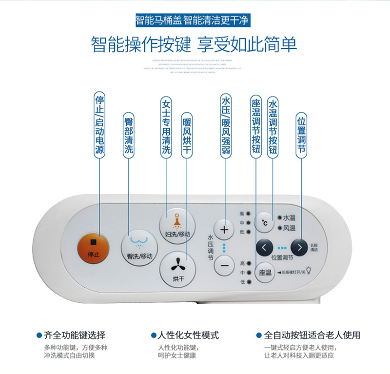 11、溫度調(diào)節(jié):可根據(jù)使用者個人喜好,調(diào)節(jié)水溫、座溫和風(fēng)溫;