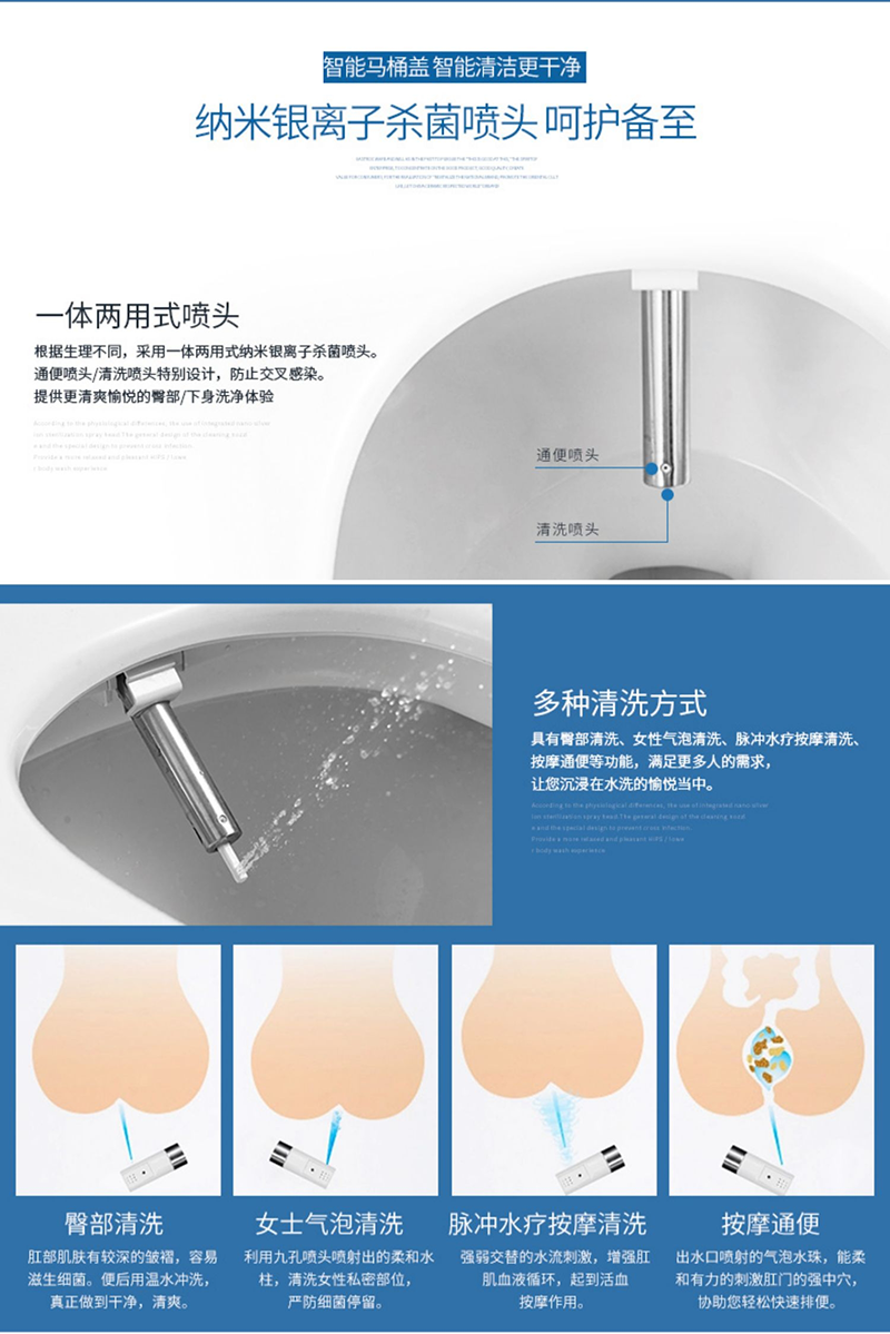 16、抗菌座圈和噴頭:座圈和噴頭均加入銀離子抗菌成分,不易滋生細菌;